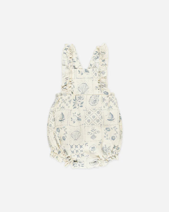 This sweet bubble romper features criss-cross ruffle straps, ruffle leg openings, and bottom snaps for easy changes.
