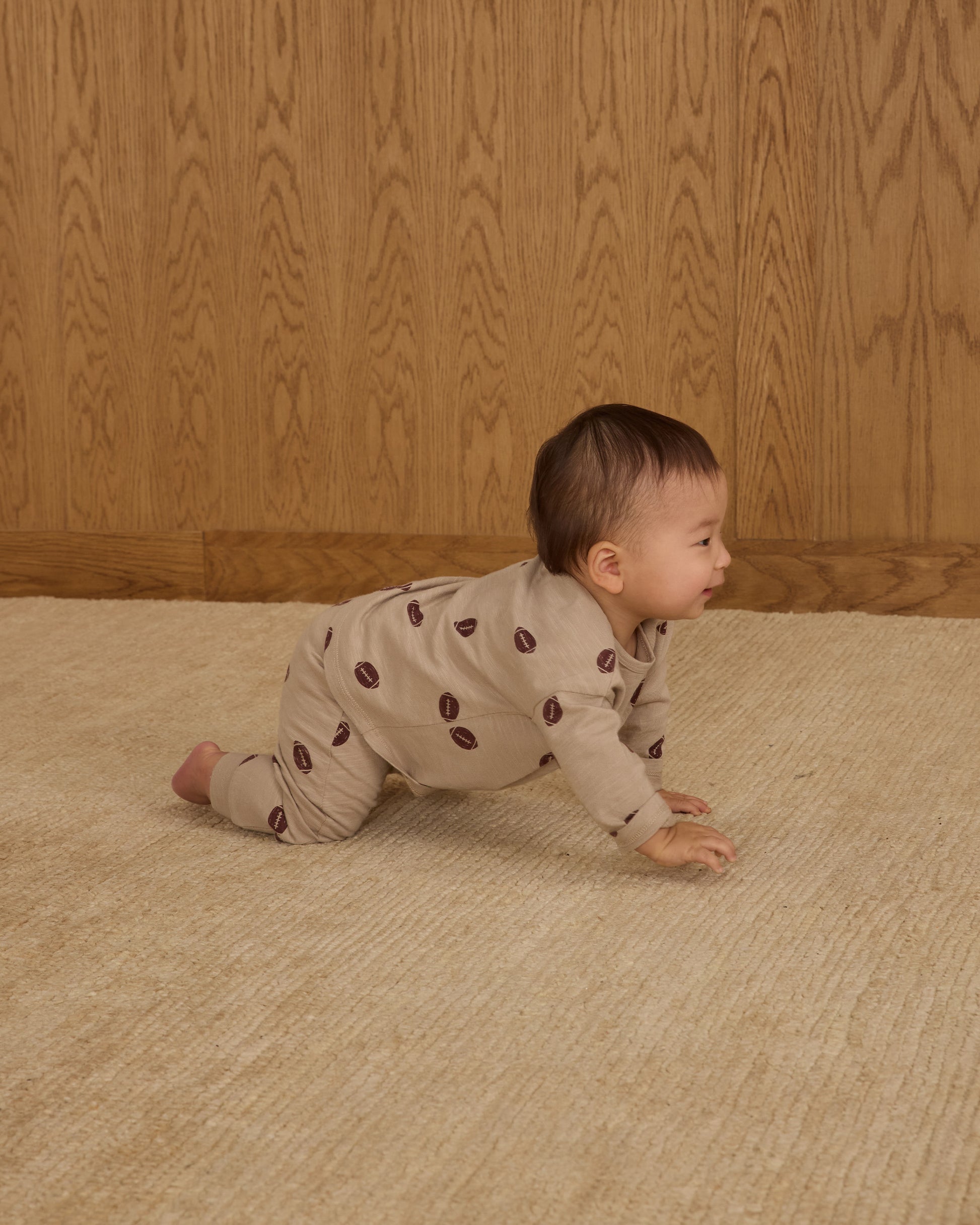 Our Henley Jumpsuit features a bubble silhouette with elasticized wrist and ankle openings, a two-button front placket, and bottom snaps for easy changes.