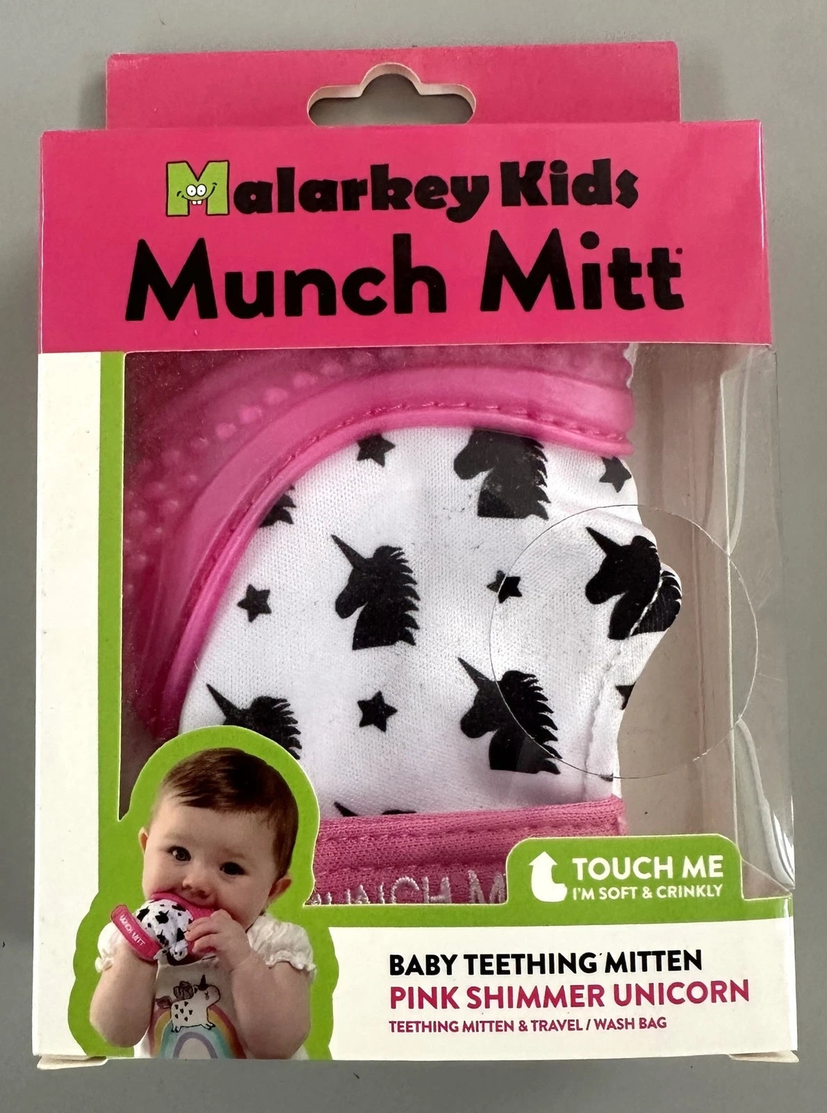 The original, mom-invented Munch Mitt is the world's first silicone teething mitt. It is a wearable teething toy for infants who cannot grasp or hold a standard teether.