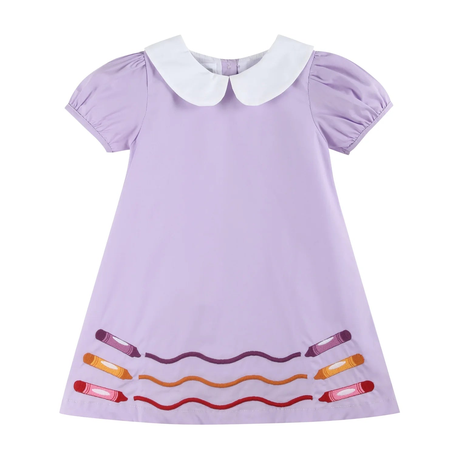 Elevate Back to School style with our Purple Crayon Collared Dress! The classic white collar adds a touch of sophistication, while the embroidered crayons on the dress bottoms bring playful charm. Let your sweet girl make a colorful statement in this adorable ensemble.