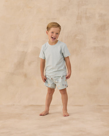 Featuring our 'floatie' print on our 'seafoam' hue. This fun retro print will bounce you right into summer.